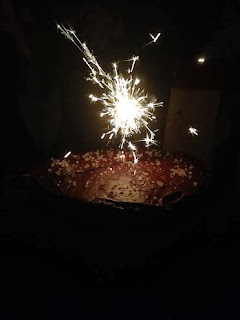 Anna gave me this cute candle one year and I keep forgetting about it, until Sunday! It was a sparkler, and the cutest thing ever. Dave got some pretty awesome pictures of us all freaking out when it started "sparkling".